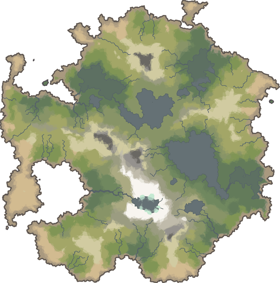 Aurora is a very large landmass that protrudes from the heavy cloud cover that (as far as aurorans know) covers the entire rest of the world. in the center of the “island” a vast mountainous expanse rises, splitting the terrain in two. The highest points of this area are known as the Roduran Serra, and with the high clouds trapped by the serra, the area at the east is very rainy, forming the Perlin Sea, a huge freshwater lake that nurtures most of Eastern Aurora. Lush vegetation surrounds most of it and so the largest and most prosperous kingdoms in the island call these lands their home. To the south, drier steppes and woodlands are the home of countless nomads, with small settlements in the woods between the expanses of razorgrass.